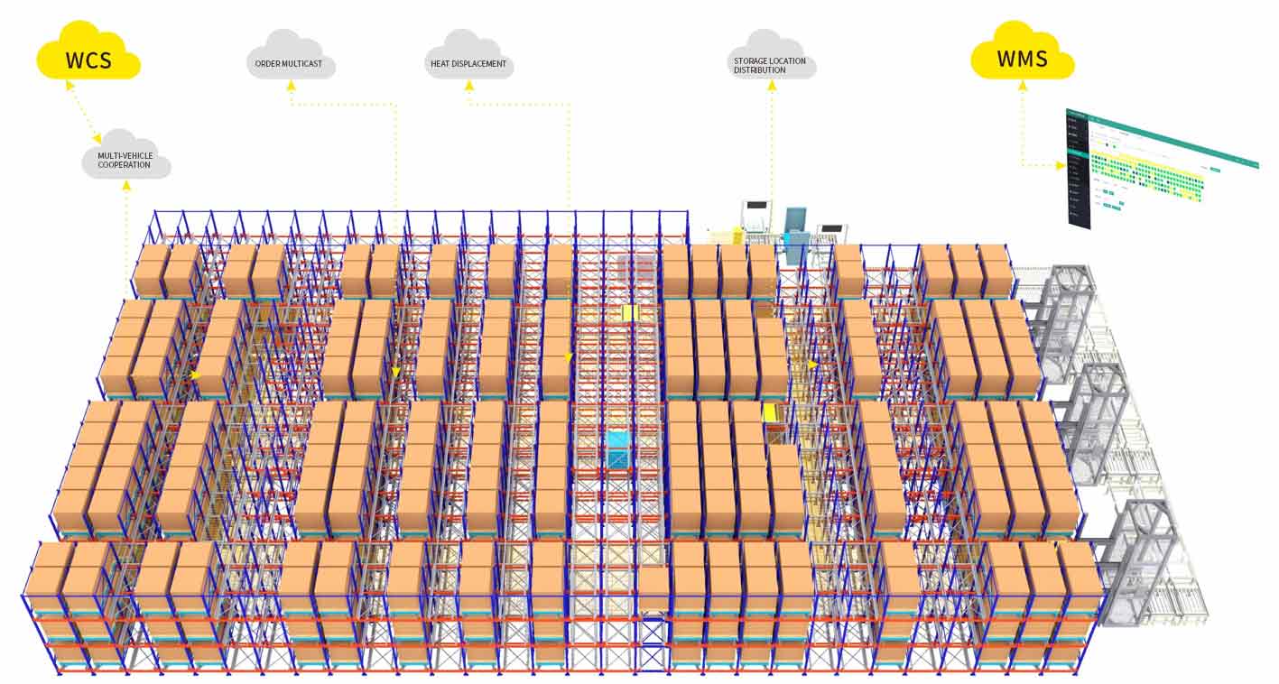 Multiple shuttles operate in parallel, supported by intelligent algorithms that optimize task allocation and path planning, significantly enhancing throughput capacity.