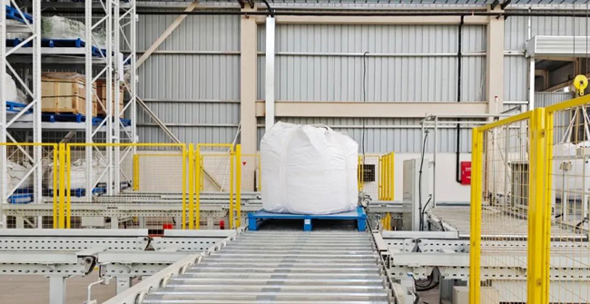 Given that the customer's materials use a unique ton bag packaging form for refractory materials, Yufeng Intelligent has designed a system where mother pallets do not leave the warehouse. The pallet unpacking machine is located on the first floor at the inbound area; when raw materials are received, the system automatically retrieves a set of pallets and unpacks them for use with inbound goods.An unpacking pallet machine is set up in the inbound area, where the empty pallets generated after material preparation are stacked. Once the stacking is complete, the stacker automatically stores the pallets in the automated warehouse.