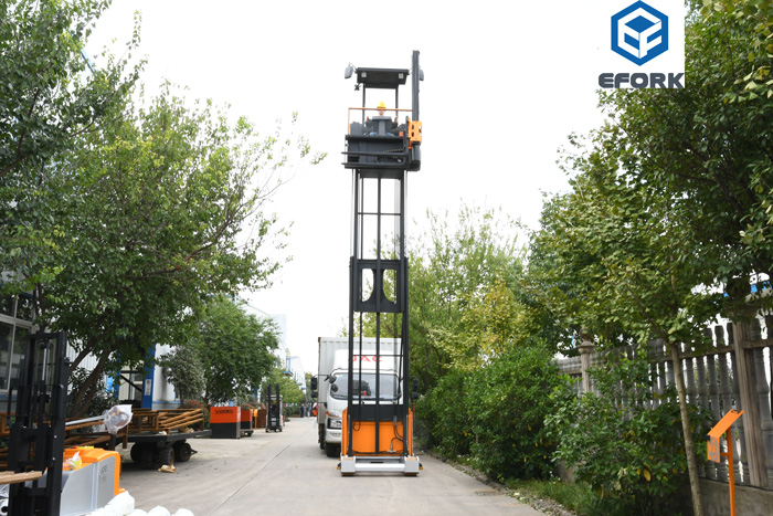 The three-way stacker forklift has a powerful high-position operation performance. The rated load and lifting height can be customized according to customer needs, rated load of 1500KG,  with the highest lifting height reaching 14.5 meters, meeting the stacking requirements of goods on high-position racks. The design of the operator following the forklift up allows the operator to have a panoramic view and pick goods manually while stacking, realizing the dual function of the stacker forklift and effectively improving operation efficiency.